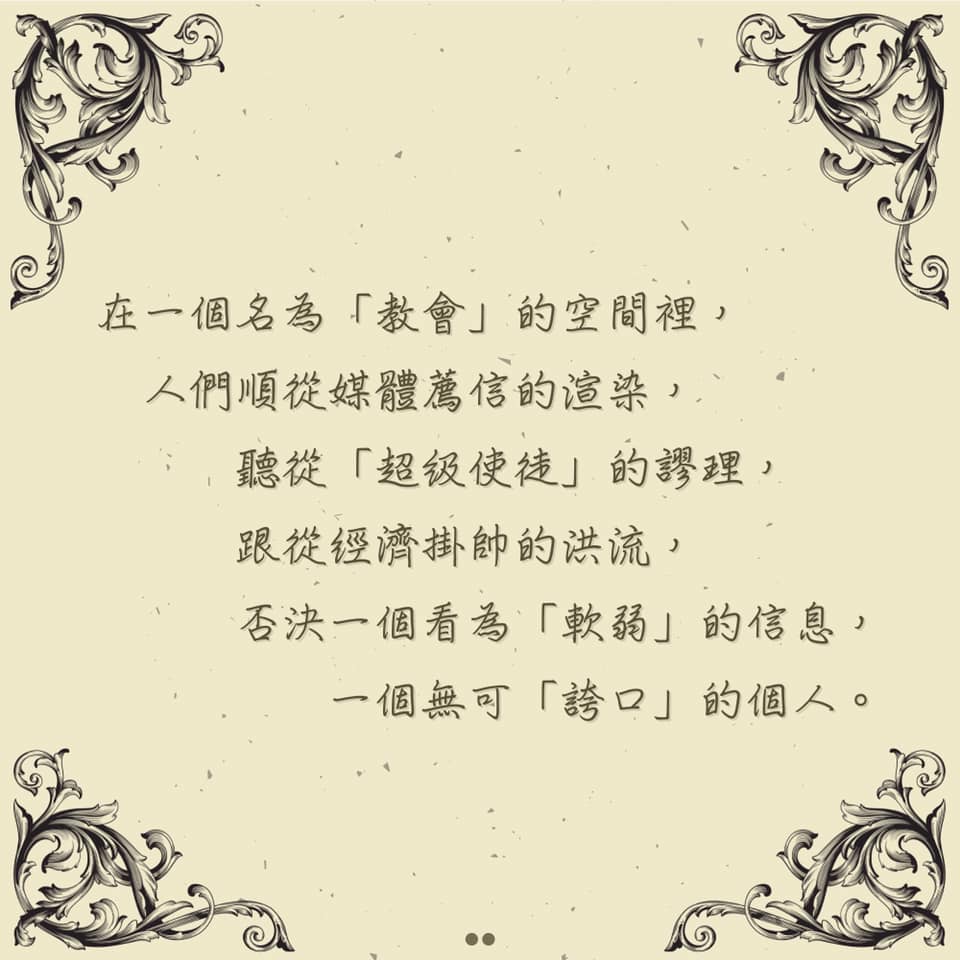 病毒或許是「中性」的,它不必然是全然的負面,畢竟在這個社會的遊戲規則裡,我們習以為常戴上不同的「面具」來應對他人,甚至面對信仰。此刻,它只是戳破很多虛假的事物,推每個人回去看待自己的本相,看待自己與同住者的關係,看待自己與上帝的關係,重新尋求一份生命的真,尋求到底何為生命中最重要的價值。我們不得不作出調整,不得不「習慣」於新的生活模式,也在這當下,看見或聽見許多無聲吶喊的人們,真正軟弱的人們,或是孩子、或是老人、或是遊民、或是社會中任一角落的邊緣人…..。