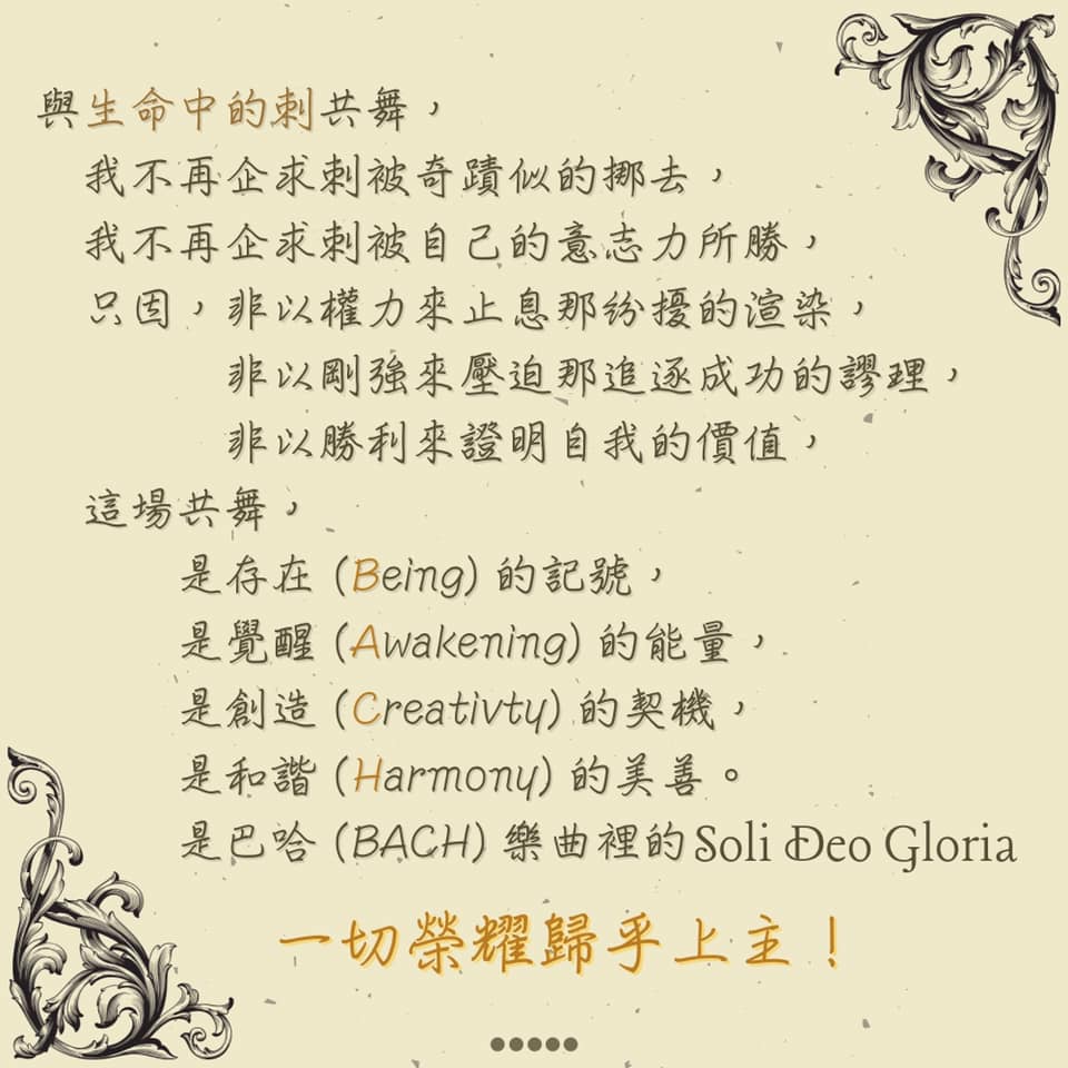 一位音樂家朋友周美君老師聊著她自己的「巴哈經驗」(BACH),通過演奏,通過與樂曲的對話,找到自己的存在(Being),是無條件的被接納,進而開始覺醒(Awakeng),與自己共舞,與他人共舞,湧出真實的創造(Creativity),創造問題、面對問題、解決問題,到最後發現「沒有問題」,是一趟心甘情願的和諧(Harmony)之旅。