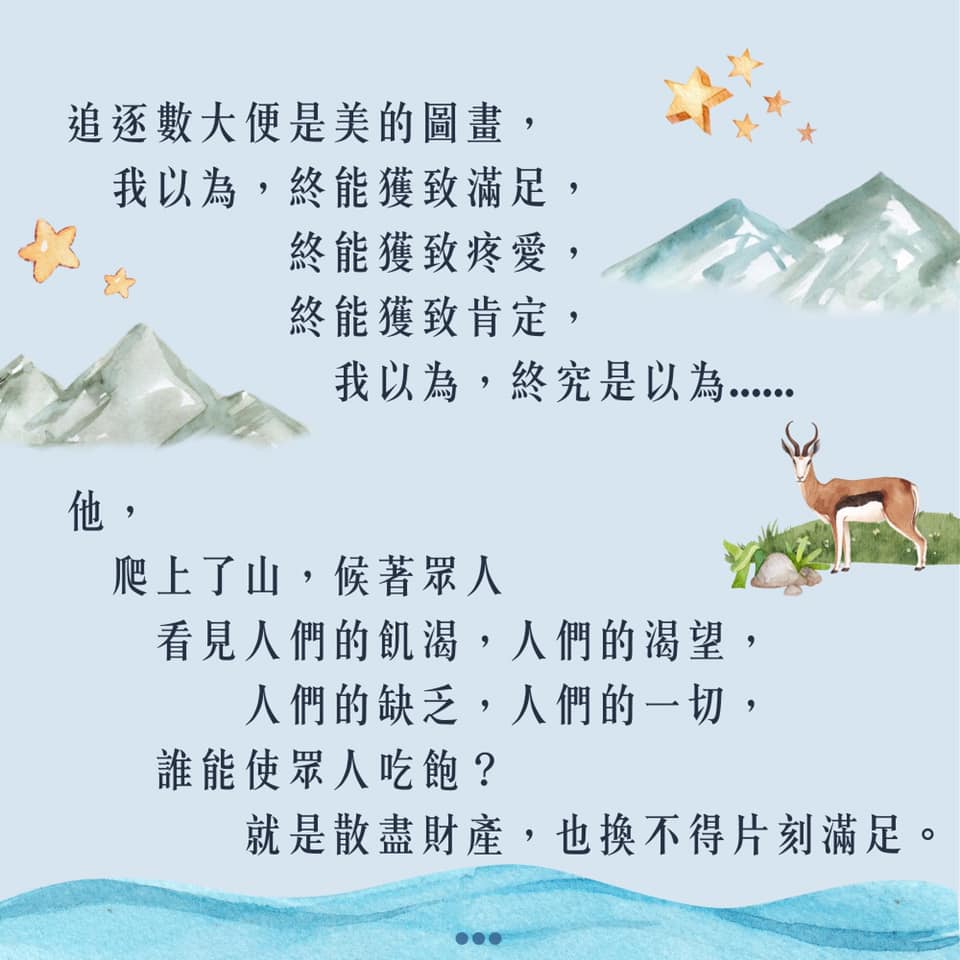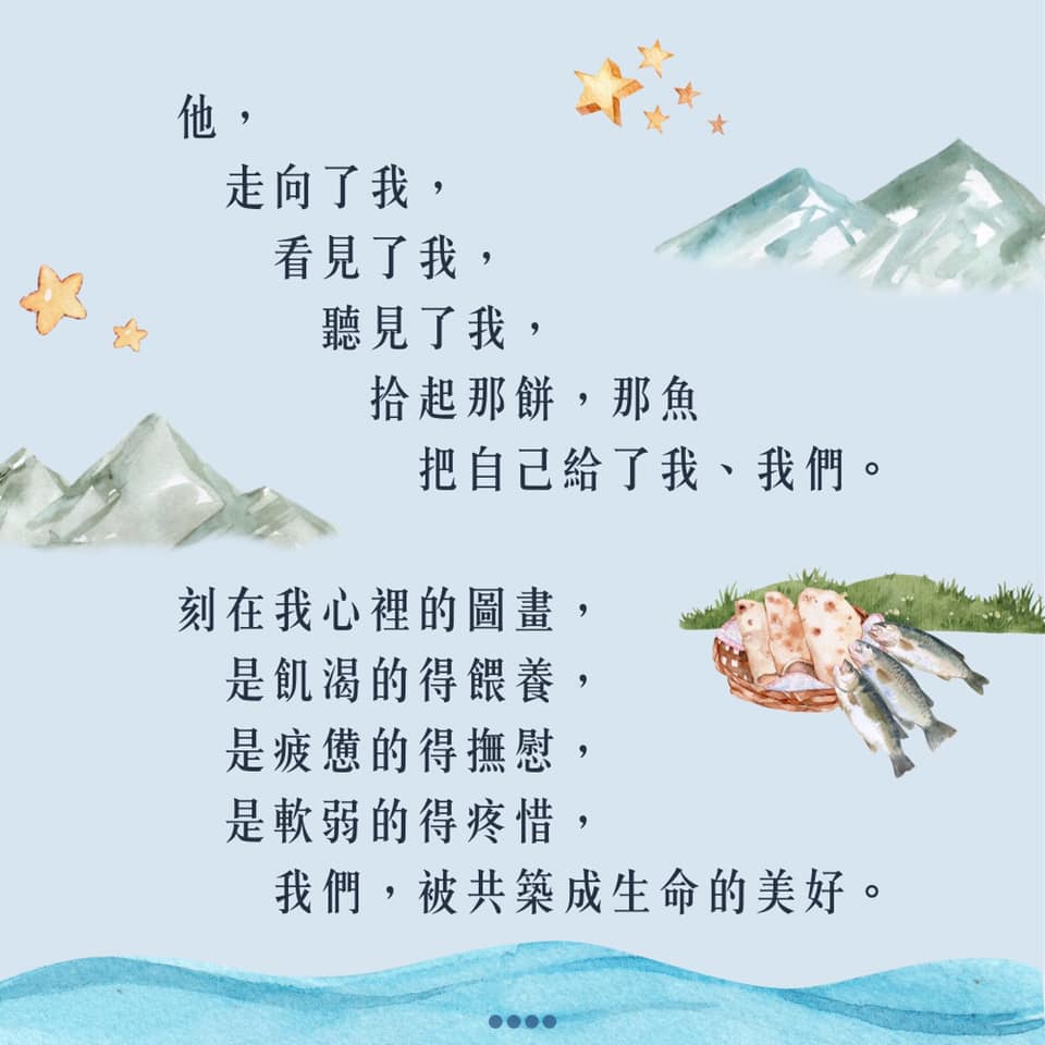 我們,被邀請進入耶穌心裡的圖畫,參與在那被餵養的群眾裡,參與在那心裡膽怯卻漸漸學習憑信心前行的行列,參與在那看見不同可能性且願意付出的行動。我們,被邀請進入一份美好,只可惜太多時候,我們焦急地被自己心裡的圖畫所束縛,被自己既定的想像所限制,以致急著想抓住些什麼,想為耶穌做些什麼,卻忽略了,如果耶穌不在這裡呢?