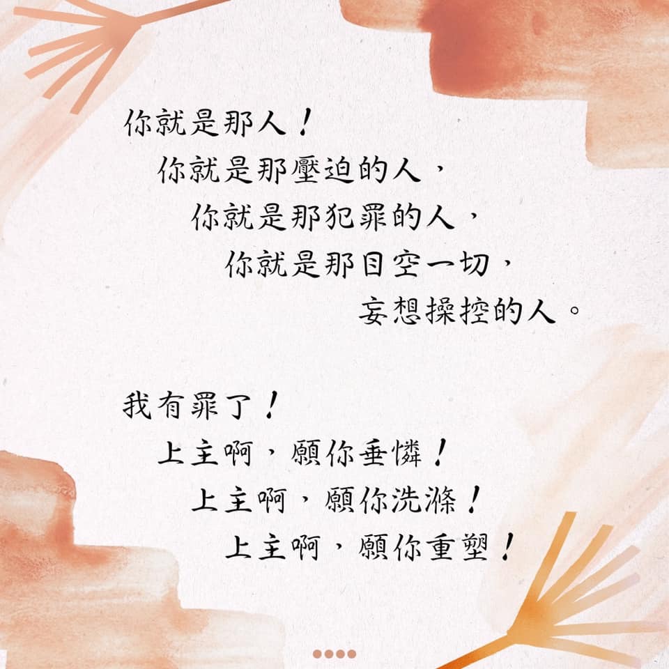 「你就是那人!」是生命很大的自由,我們可以不再需要通過外在的形式掩蓋自己內心的欠缺,可以不再需要追逐身份地位來捍衛自己的軟弱。我知道自己是有罪的人,我更知道自己常常通過嘴裡說有罪,來掩蓋心裡面真正的恐懼。此刻,就在耶穌基督的十字架上,我們的罪與他一同受釘,被受邀專注於耶穌的行動,從我是誰走向耶穌是誰,認識與每個人同行的上主。