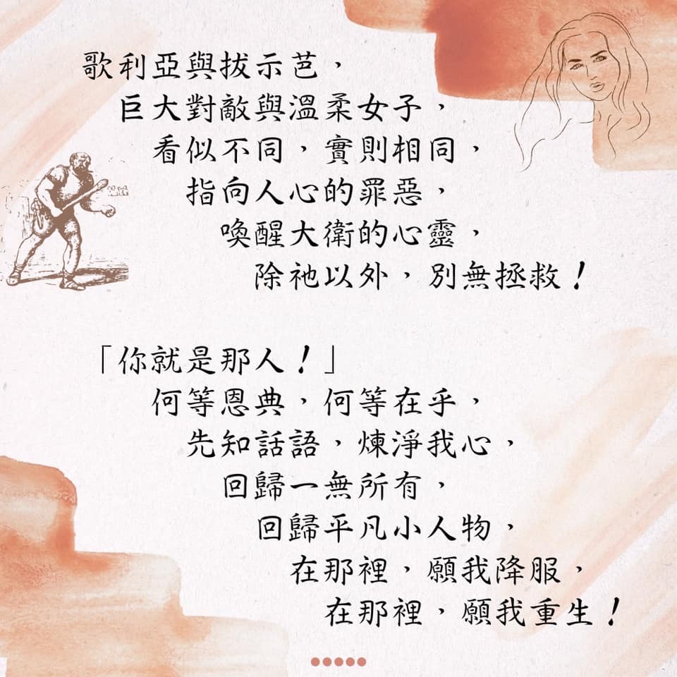 「你就是那人!」喚醒我們從自以為安全的地方,走向屬於自己的賽場,我們會害怕、會恐懼、會犯錯、會軟弱,但上主在我們生命中的作為,遠遠超過我們自己的想像。大衛生命的高低起伏,向我們揭露一個真正的「人」,如何得蒙上主拯救,話語鮮化我們的想像,對我們發出邀請,成為「所是」(to be),而非所為(not to have)。