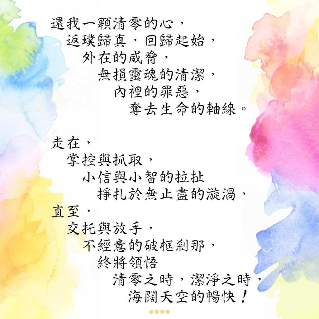 隨著三個多月來的疫情終於瞥見「嘉玲」出現,人們內心不禁小小慶賀了一番,雖知這還不到最後的勝利,但已走在漸漸「清零」的路上。各級學校九月開學,所有的學生們返回校園,政府、學校、每個家庭都清楚知道,或有另一波的考驗將來到,然而前一階段的成果,必成為下一階段的基石,推動同島一命的社會向前。每個跟隨基督的夥伴也是一樣,我們有時會被罪的引誘所左右,導致純淨的心受到污染,基督在十字架的愛卻早已勝過這一切,還給我們一顆清零的心,好叫我們活出嶄新的樣貌。