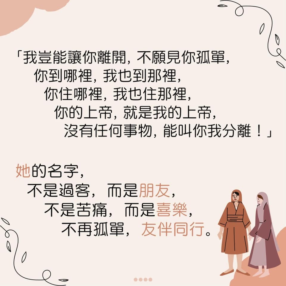 兩個兒子瑪倫和基連,名字的意思更令人莞爾,分別是「疾病」與「虛弱」,又有誰會把自己的孩子取這名字呢?隨著以利米勒死了,剩下拿娥美和兩個兒子,他們在當地娶了兩個摩押女子–娥珥巴和路得,只是十年後,瑪倫和基連也死了。一個失去男人的家庭,守寡又喪子的拿娥美,剩下兩個外邦媳婦,等同失去了一切,未來的路,已是黯淡一片。