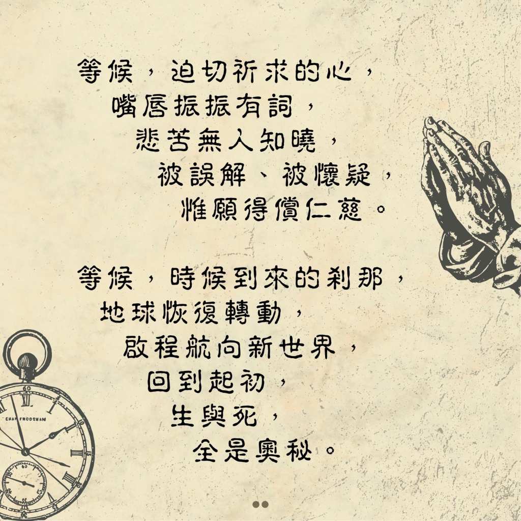 前一個禮拜,家中來電告知外婆的身體狀況已經很不穩定,在祈禱中,我們也思考著該如何教導孩子們禱告,是禱告說讓她奇蹟似的好轉嗎?恐怕不會是如此,在面對人生最末階段,我們能禱告的,僅有願上帝的心意成就,願每一個身旁的人都得著平安。