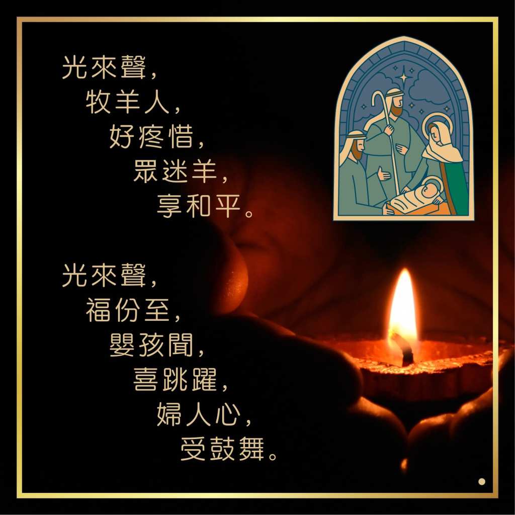 被世俗纏索的我們,不知不覺失去對聖誕的期盼;被重擔壓住的我們,模糊了對上主聲音的敏感。我們誤以為,可以靠著自己的能力抓住一切,可以靠自己的盤算籌劃未來,卻忘記了,自己的生命已然失去盼望,失去喜樂。就在聖誕,我們要再次聆聽光來聲,並在每一個心回應中得著愛,看見榮光。