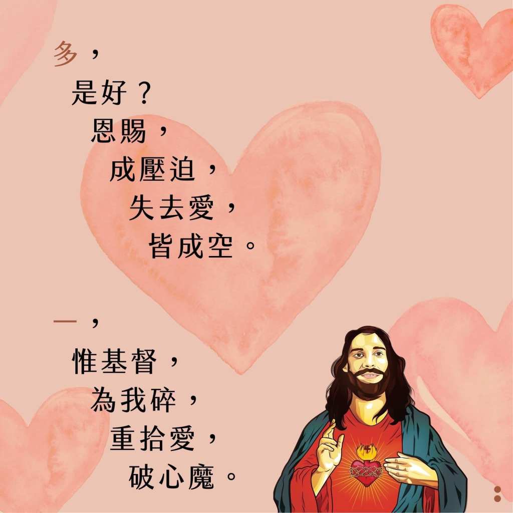 一個「多」的時代,每個人有不同的背景,不同的經驗,不同的想法,基督的愛把我們眾人聚集在一起,為要共同尋找一條跟隨他的道路。當然,忙碌於生活的我們,總在為許多事疲於奔命的時候,被心裡的那隻慾望巨獸所掌控,忘記了基督正伴隨在我們身旁。