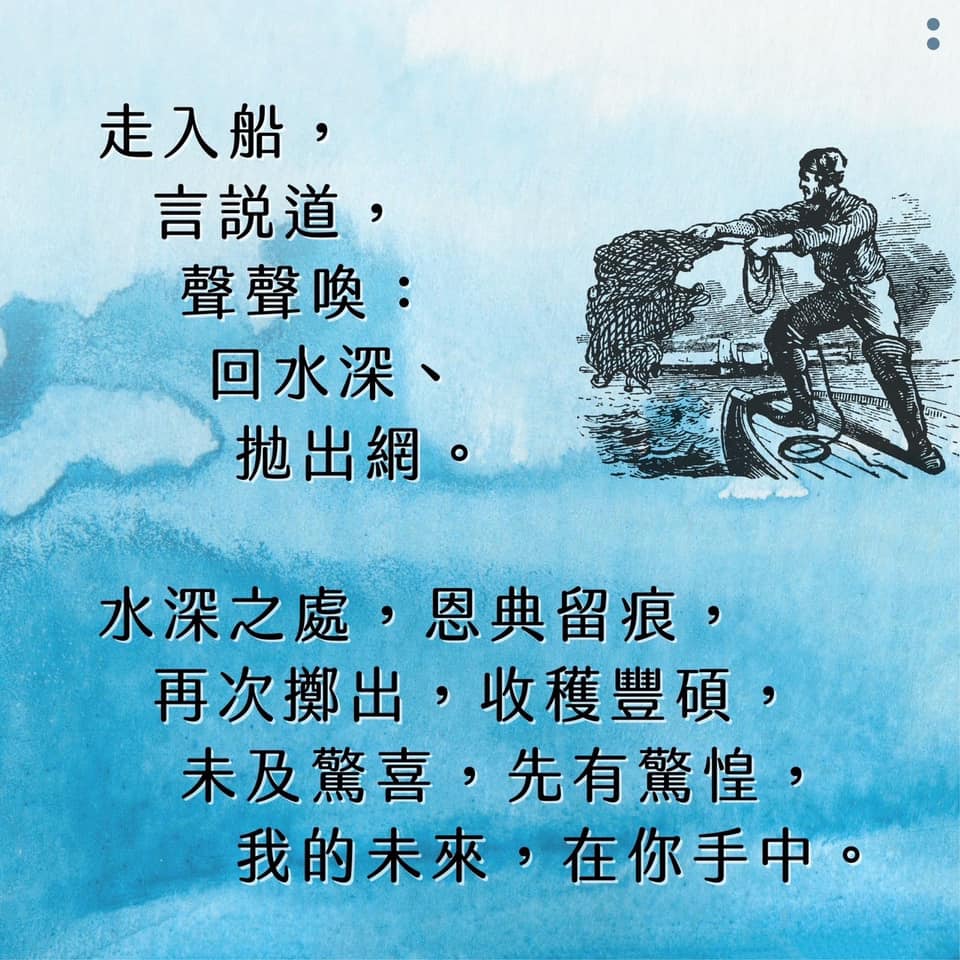 水深之處,是黑暗,是失敗,是破碎,是焦慮,但,亦是恩典!我們帶著不足為外人道之的故事來到基督面前,或者,是基督自己進入了你我的心房,在那裡敲門,像你我說:「下網打魚吧!」愈是失落之地,愈是神聖之地,愈是恩典之地,我們就站在那裡,活在此刻,並且,擁有全新的未來!