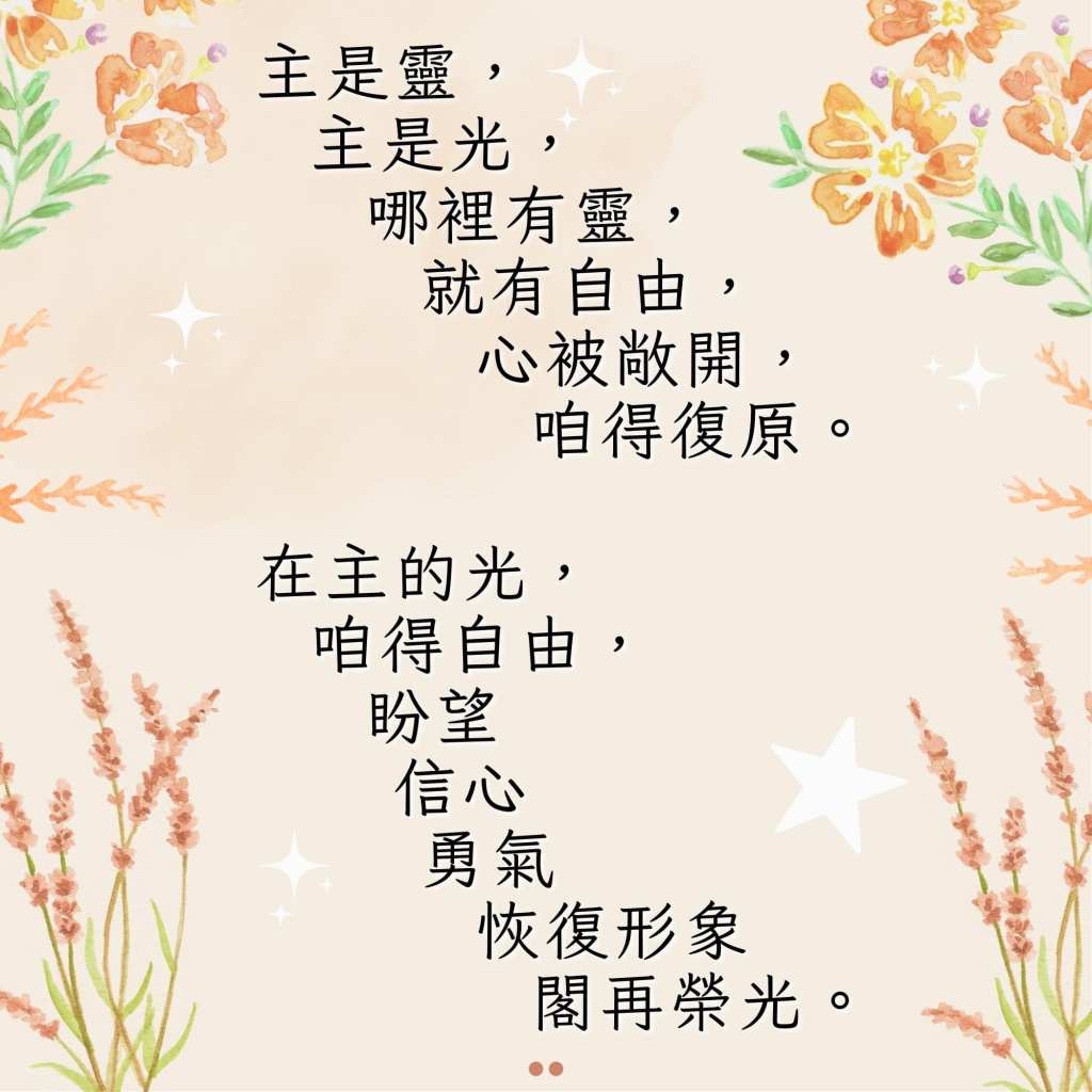 因著與基督連結,我們臉上的帕子被揭去,得以看見主的榮耀,也讓每個人的生命映照出主的形象。保羅說:「主就是聖靈,主的靈在哪裡,那裡就有自由。」使徒承受著眾人的質疑,卻依舊沒有失落盼望。相反的,他更有深遠的期盼,哪怕此刻彼此陷入一種苦楚之中,是懷疑,是爭執,好像失去自由,但就在主基督的憐憫裡,如今的苦不過暫時,那將要來的榮耀必要勝過過去,使我們成為他的樣式,有更輝煌的榮耀。
