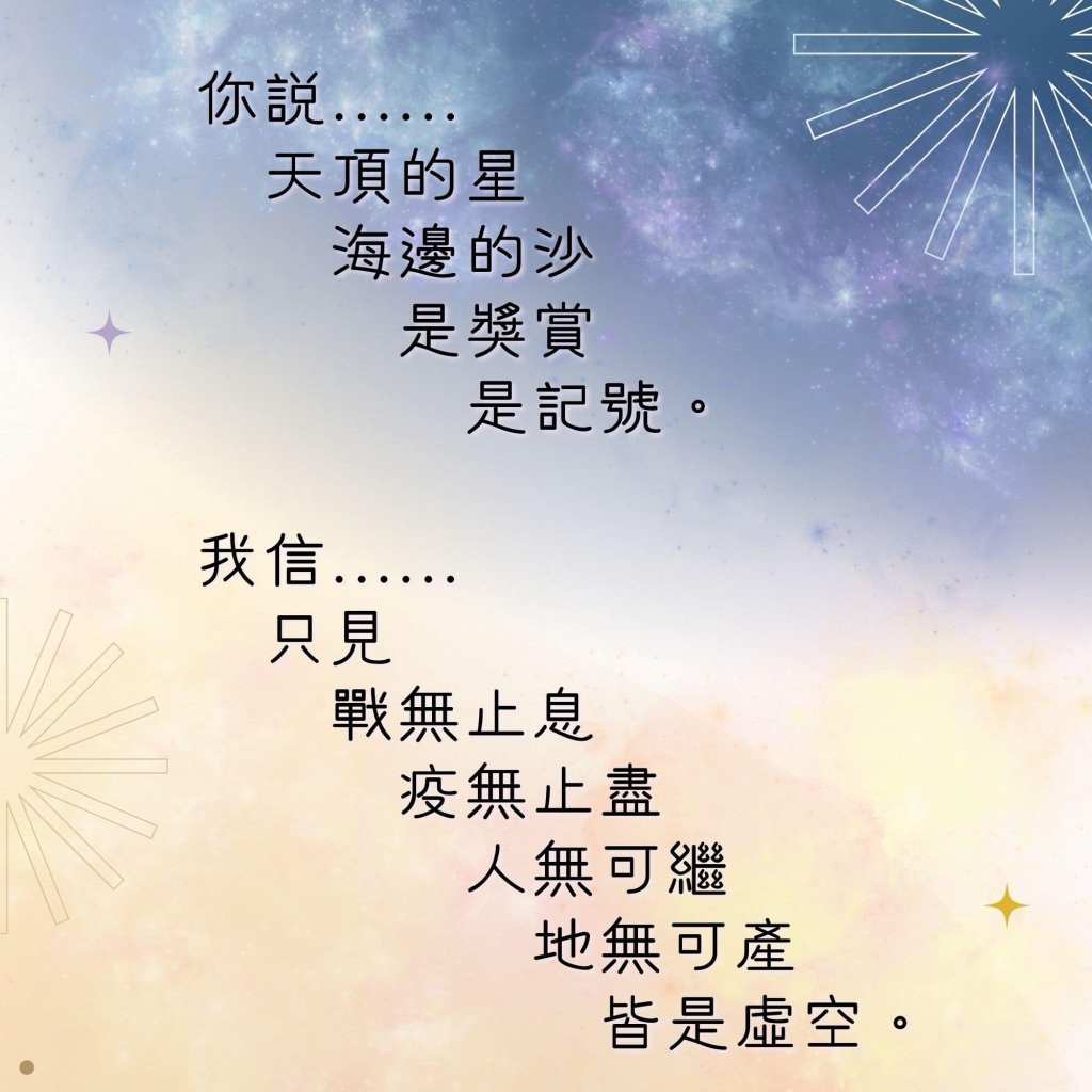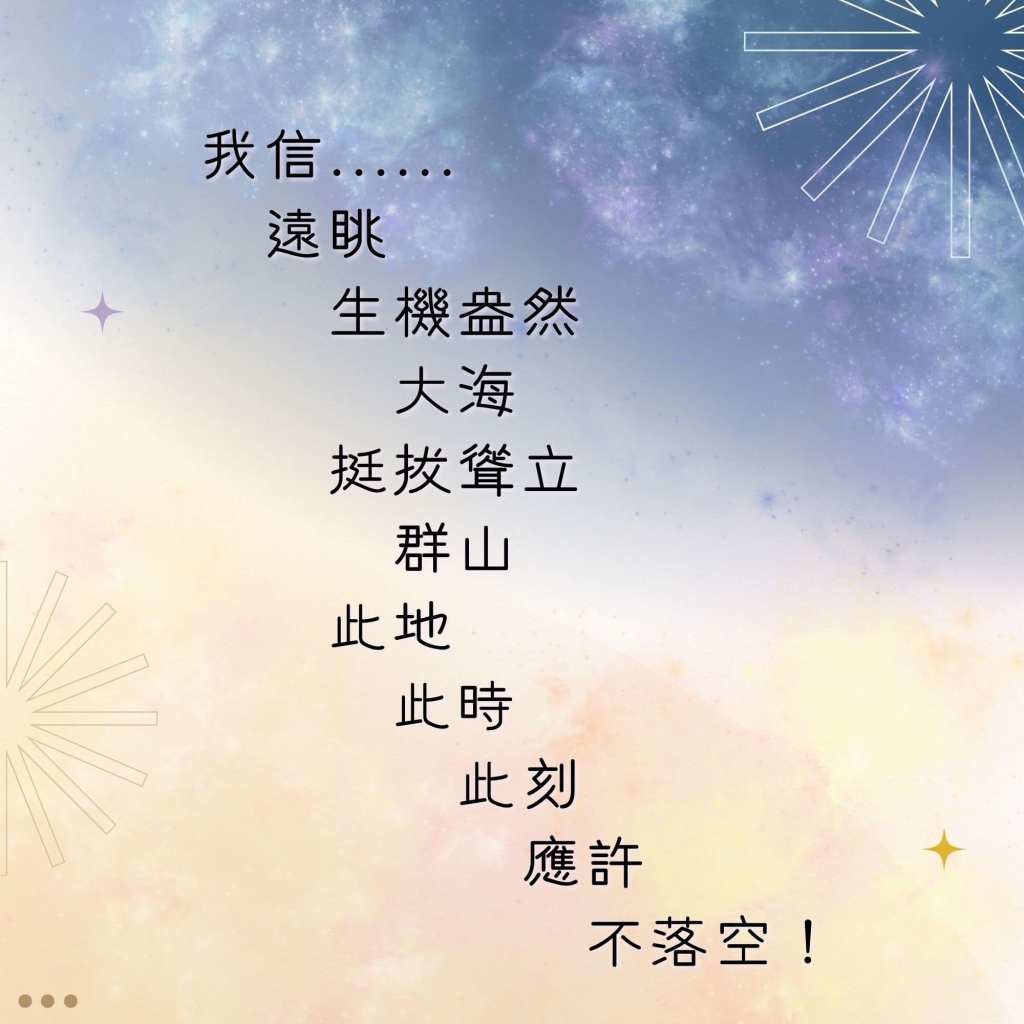 「我們相信上主嗎?」我們會高聲說:「我信…..」即便遭遇失敗,陷入患難與危機,我們仍舊相信嗎?就在這麼一個戰無止息、疫無止盡、人無可繼、地無所產的世代,「我信……但……我信不足。」亞伯蘭的疑問,同樣是我們內心的疑問,然而那句一瞬間的轉變:「亞伯蘭信上主,上主就認他為義人」再次喚醒了我們,上主始終都在!