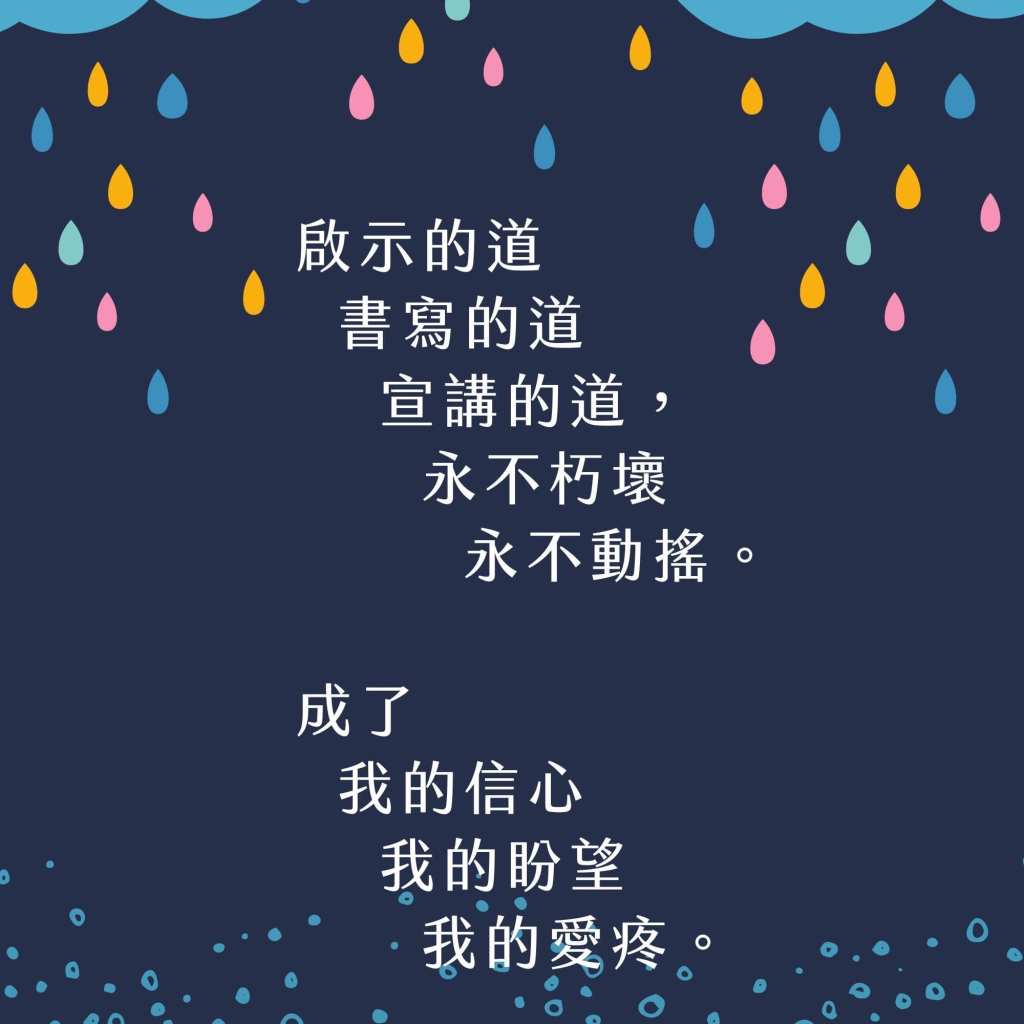 上帝的道,是我們向前唯一的盼望,也是唯一的動力。神學家卡爾巴特說,上帝的道分為三種:啟示的道,書寫的道,宣講的道。啟示的道就是耶穌基督,書寫的道就是見證啟示的道,也就是聖經的話語,在宣講中,我們有著基督的臨在,帶來啟示,帶來見證,也帶來盼望!