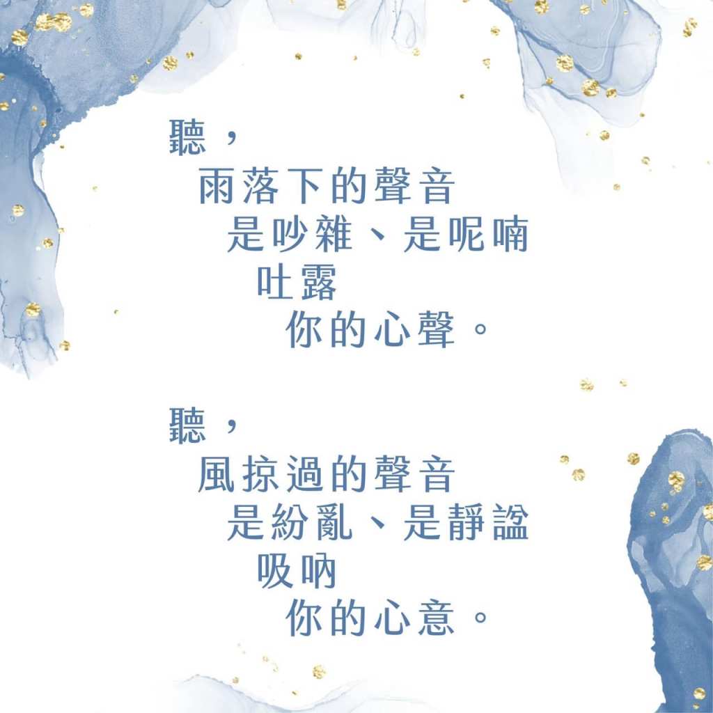 每天,有無數的聲音漫過你我耳朵,我們或毫不在意,或被影響心情,或從中聽見特別的收穫;同樣的,每天有無數的訊息闖入你我生活,我們或難分辨真偽,或被左右判斷。聽,是一門藝術,是我們在忙亂生活裡的一門操練,誰能夠聽得清楚,聽出真實的聲音,聽出上帝的道,方能走在一條不偏左不偏右的道路,瞥見祝福。