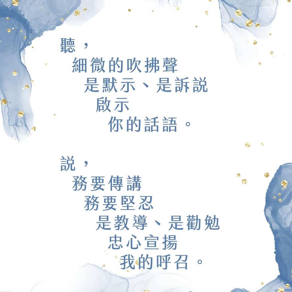 「你要持守所接受和確信的真理,你曉得誰是你的導師,你也記得你從小就明白聖經,就是能給你智慧、指引你藉著信基督耶穌而獲得拯救的那本書。」上帝的奧秘,是每個服事者一生持守的真道,我們延續前人的腳蹤,遵循師傅的教導,看見耶穌基督如何顯現。每一次的禱告,都是對於話語的尋求,更是跟隨基督的回應。
