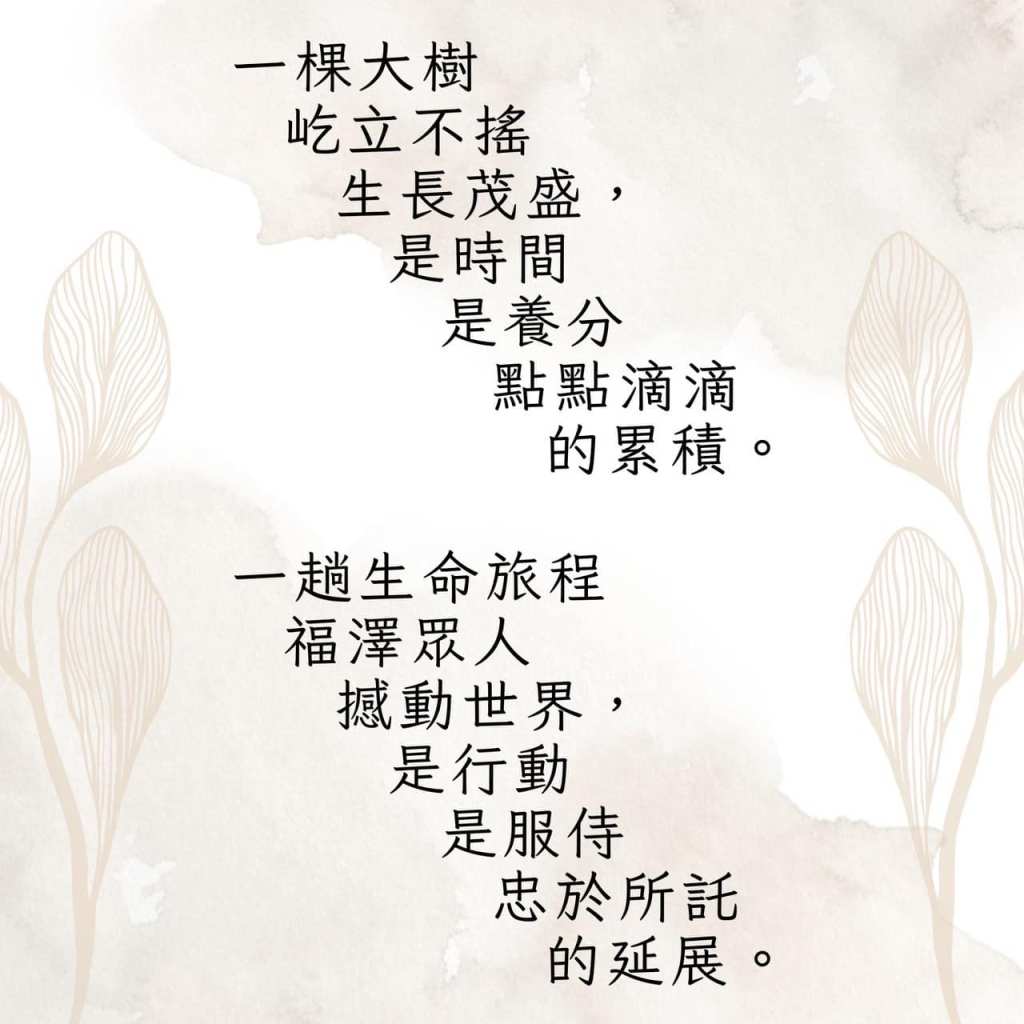 一位老牧師的手稿裡記載著一段話:「服事上帝不在於恩賜,不在於能力,唯一重要的是『忠心』。」基督僕人忠心的榜樣宛若一棵大樹一樣,我們可以看見他屹立不搖,持續展現的生命力,這是一幅大圖畫。隱藏在大圖畫背後的,是看不見點點滴滴的累積,看得見的樹木有多大多大茂盛,蘊藏在底下的根就有多豐厚。緊接著,枝葉延展,澤披周遭需要的人群,綻放出一朵朵美麗的花。