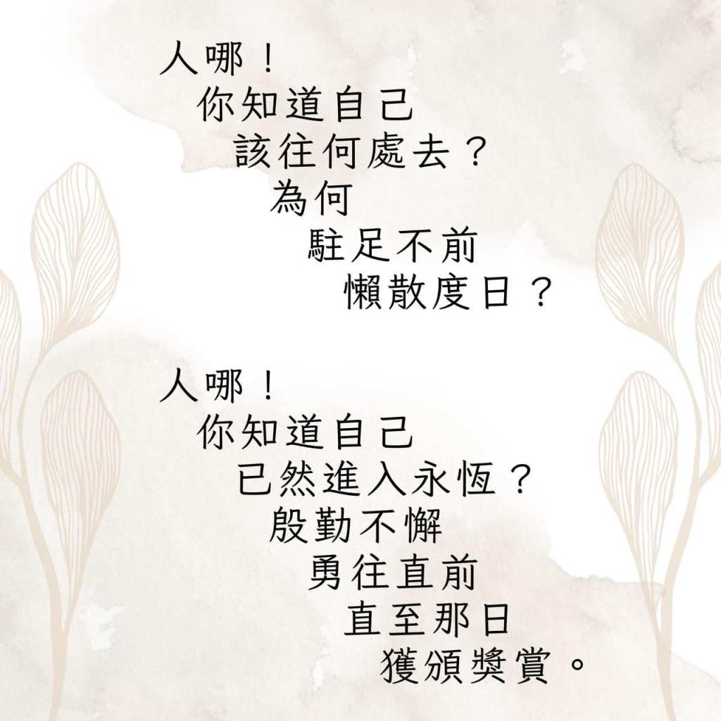 忠心,是不畏懼的勇往直前,不被外在的言論所迷惑,而專注在所領受的呼召。如此,身旁未曾認識基督的人,並非被我們的宗教語言所說服,並非被我們刻意營造出來的氛圍所左右,而是單單因著在我們身上,有機會與基督會遇,共同經歷生命轉變的神蹟。宣揚福音,必然從忠於所託作為起點,邀請他者在這趟旅程看見豐富,共赴美好的宴席。